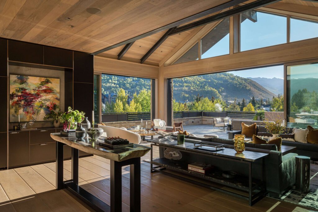 Grand interiors feature custom crystal lighting by local artist Jim Vilona, rooms wrapped in Loro Piana cashmere, extra-wide plank oak flooring, a chef’s kitchen with epic mountain views, a wine cellar, generous outdoor space, and gallery walls perfect for displaying an elite collection.