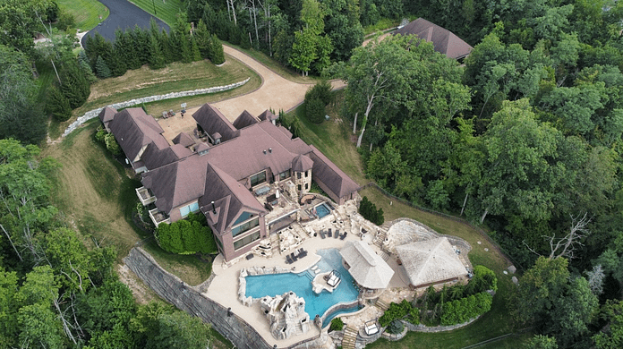 The main house features over 15,000 square feet of living space with 4 bedrooms, 5 full and 1 half bathrooms, foyer with aquarium, great room, formal dining room, kitchen, family room, office, game/rec room with wet bar, golf simulator, cigar lounge, 2-lane bowling alley, casino room, gym, 3-car garage and more. The detached 6-car garage features 2 lifts.