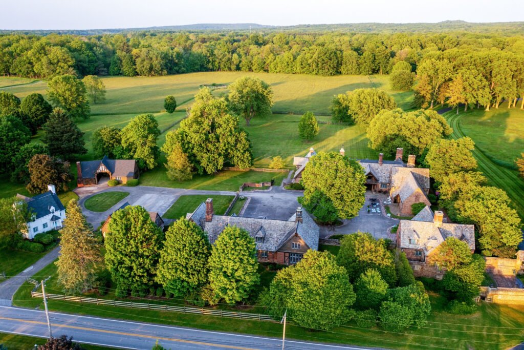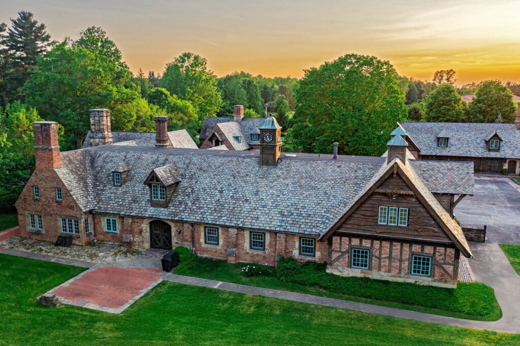 Tucked into the countryside of prestigious Waite Hill, the striking estate at 9391 Hobart Road commands attention with its tremendous pastoral beauty and meticulously preserved historical charm. The main English Tudor-style home features hand-hewed beams, hand-chiseled stone, leaded glass windows, and original wrought iron fixtures, originally designed by prominent Cleveland architect Munroe Cooper. Two additional guest cottages, an eight-car garage, dairy barn, two-story indoor squash court, blacksmith’s shop, and tractor barn amongst 27 rolling acres of land, provide limitless potential for luxurious country living, just 30 minutes from downtown Cleveland.