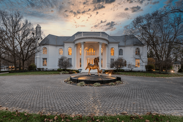 This 35-acre estate is located at 7700 Henze Road in Evansville, Indiana. It features a grand main house, guest house, 4 horse barns, detached 7-car garage and a detached 4-car garage.