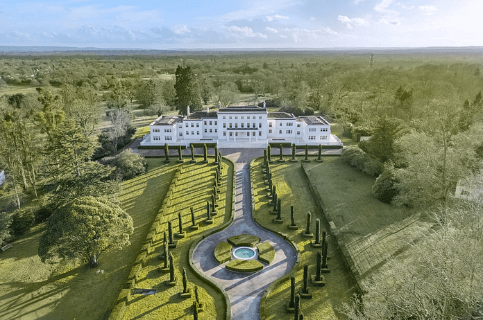 This grand home is located on Chestnut Lane in Chobham, Surrey, England, UK and is situated on over 53 acres of land.