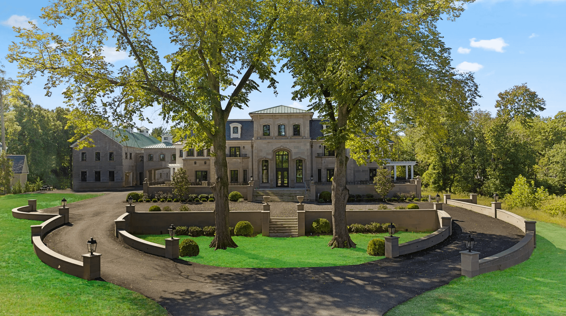 It features over 40,000 square feet of living space with 7 bedrooms, 7 full and 3 half bathrooms, 2-story foyer with double staircase, additional staircases, 2 elevators, formal living room, 2-story great room, 2-story formal dining room, gourmet kitchen with double islands, 2-story paneled library, office, billiards room with with wet bar, game room, golf simulator, home theater, gym, indoor pool, garage and more.