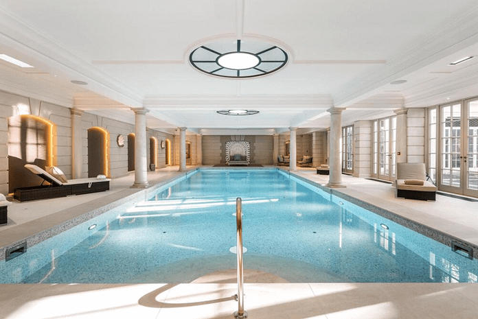 This stately brick home is located on Compton Avenue in London, England, UK. It features over 26,000 square feet of living space with 9 bedrooms, 9 bathrooms, elevator, formal living & dining rooms, kitchen, family room, office, movie theater, wine cellar, gym, indoor pool with spa, 3-car garage and more.