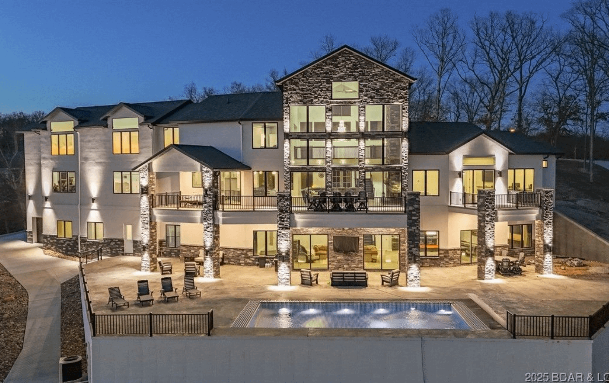 This lakefront home is located at 147 Forest Trace in Sunrise Beach, Missouri and is situated on 2 acres of land.