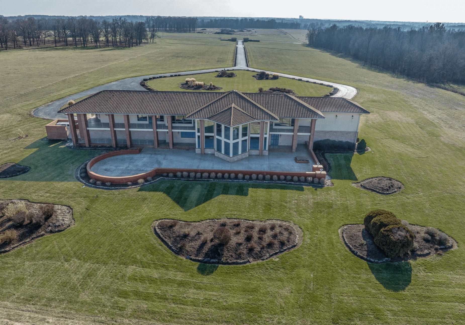 This 95-acre estate is located at 20478 Lawrence 2180 in Aurora, Missouri. It was built in 2005 and features approximately 10,516 square feet of living space with 3 bedrooms, 5 bathrooms, foyer with floating staircase, great room, formal dining room, kitchen, indoor racquetball court, 5-car garage and more.