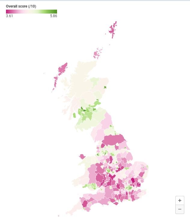 The results can be viewed on the interractive heat map below. The scores are calculated from a number of 0-10 scale questions capturing support and opposition to a number of different types of development, and the likelihood that someone says they will object to a development, within various distances of their home.