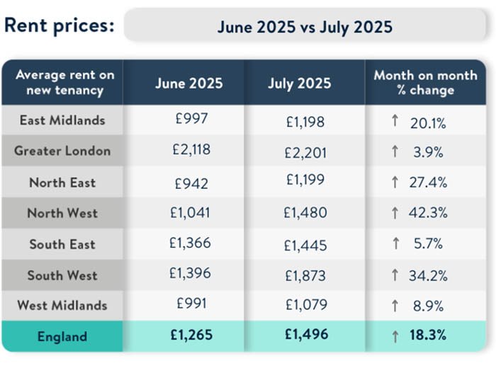 Regional month-on-month increases in the July 2025 vary dramatically. Rents in the North West surged upwards by 42%, while the South West recorded a 34% jump. In the North East, average rental prices rose by 27%. The lowest monthly increases were in London, up by 4%, and the South East, rising by 6% rise.