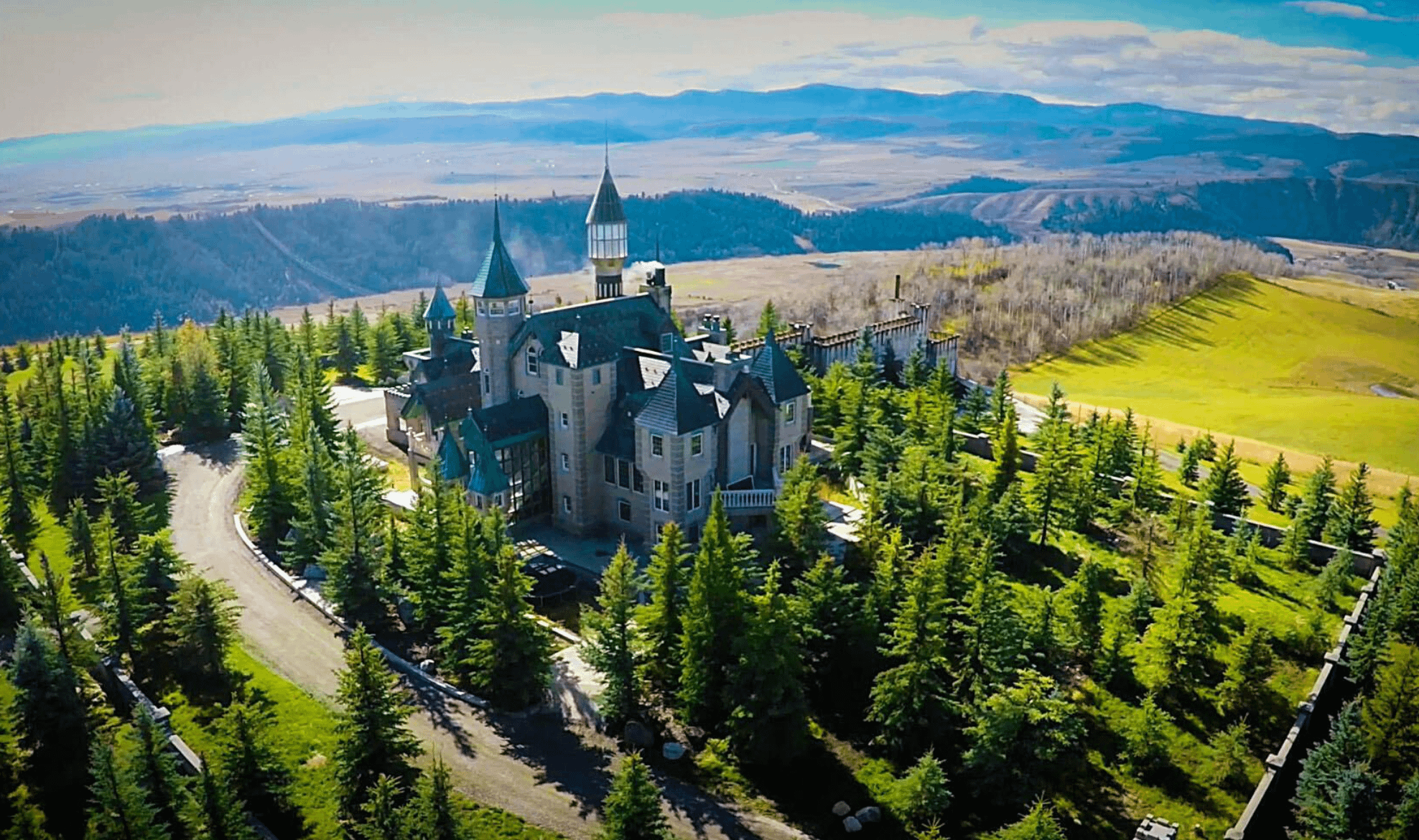 This castle-like home is located at 2150 Robinson Lane in Bedford, Wyoming and is situated on 37 acres of land.