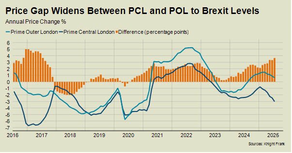 The sales market in the Capital is more split than it has been since Brexit, it says. While the average PCL price fell 3% in prime central London (PCL), there was an increase of 0.6% in prime outer London (POL). The last time the gap was wider was in 2017, which was put down to market correction after the EU vote in June 2016.