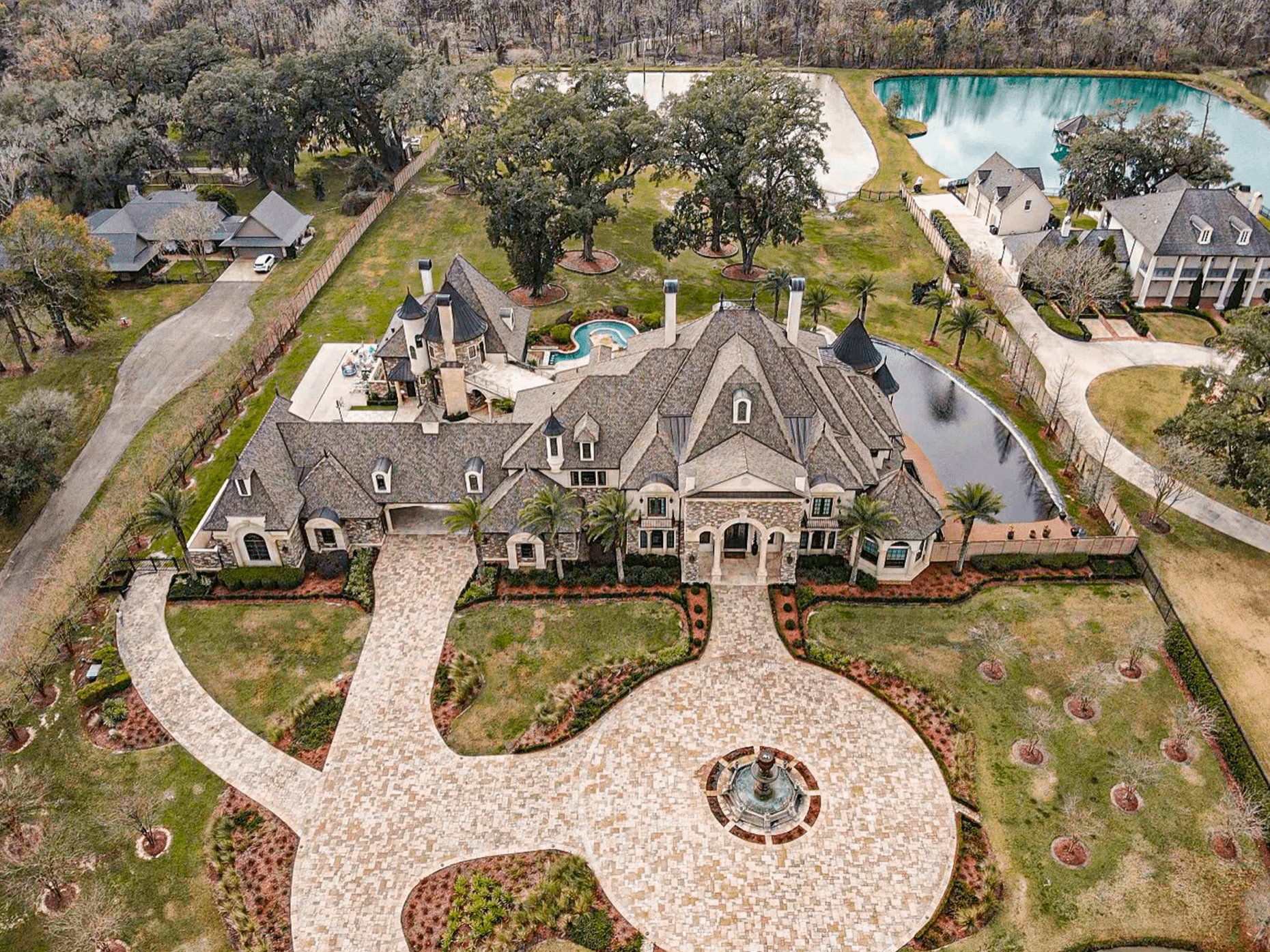 It was built in 2017 and features over 22,000 square feet of living space with 5 bedrooms, 5 full and 3 half bathrooms, foyer with double staircase, elevator, 2-story great room with aquarium and wet bar, formal dining room, kitchen, family room, office, game room with wet bar, bowling alley, movie theater, 5-car garage with workshop and more.