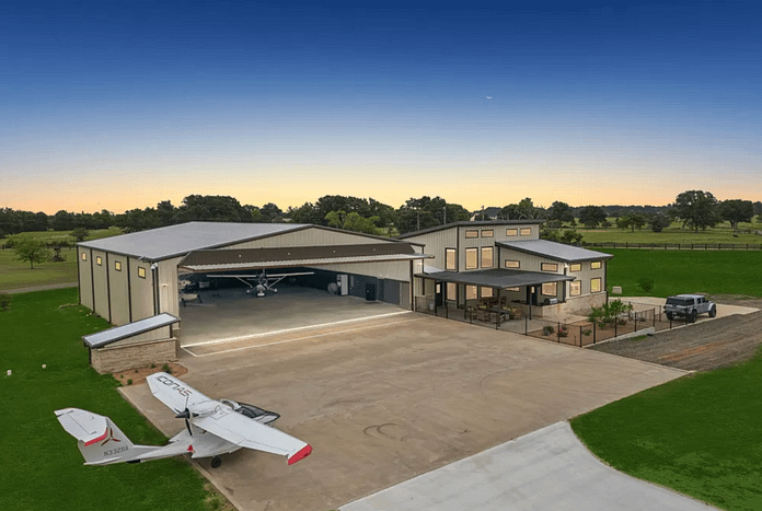 This hangar home is located at Van, Texas and is situated on an acre of land. It is located at Delva Field Airport (00TX) and boasts a 4,000′ x 70′ paved runway. Spread over 10,000 square feet, the home features living quarters, climate-controlled hangar and a large garage. The living quarters features living & dining rooms, kitchen, office and more. There is also an indoor swim-spa and outdoor kitchen/BBQ.