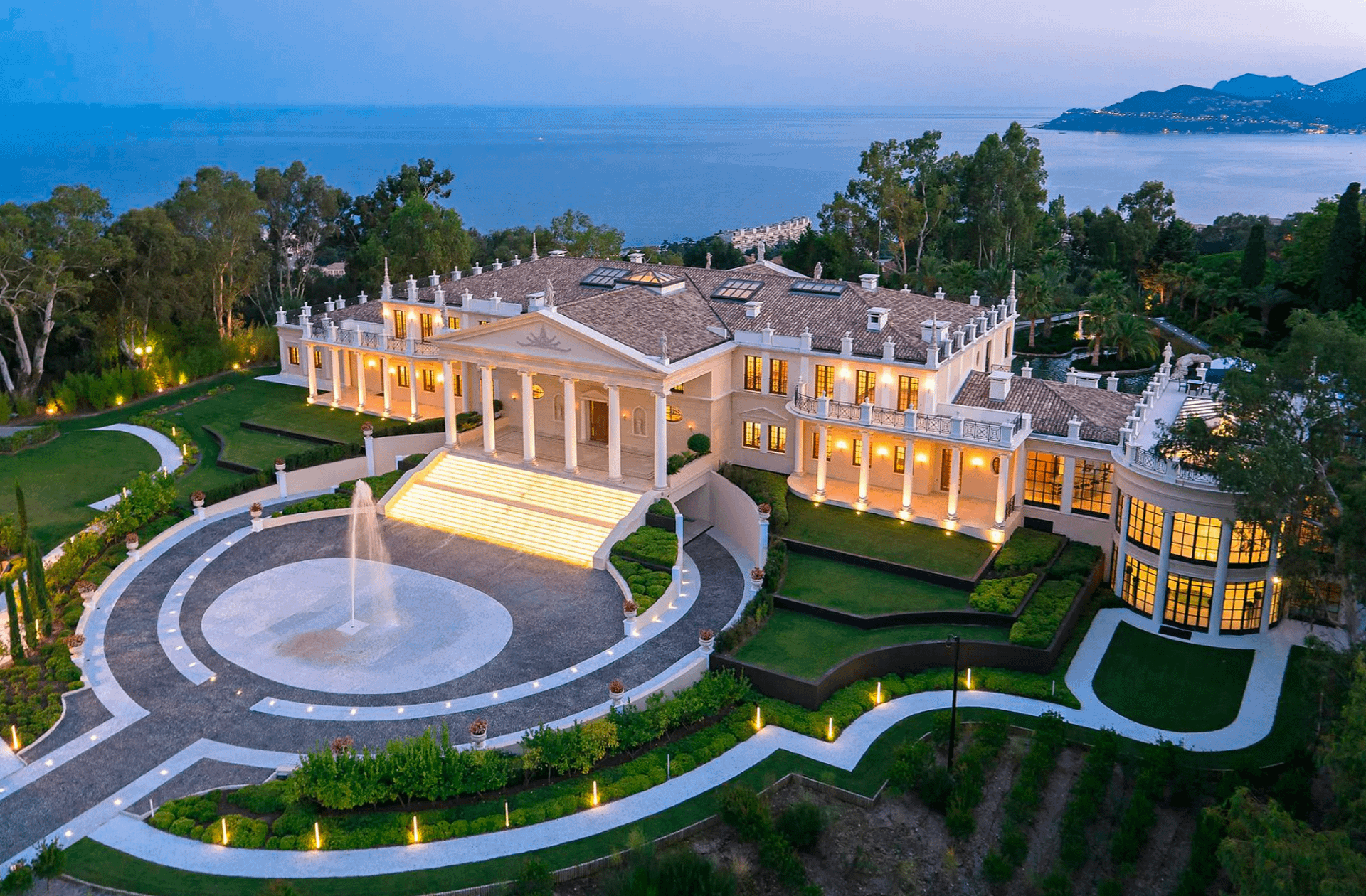 It was built by Cogemad and features over 32,000 square feet of living space with 9 bedrooms, 12+ bathrooms, grand foyer with staircase, multiple living & dining rooms, 2 kitchens, home theater, wine cellar, gym, hammam, nightclub with bar, indoor pool and much more.