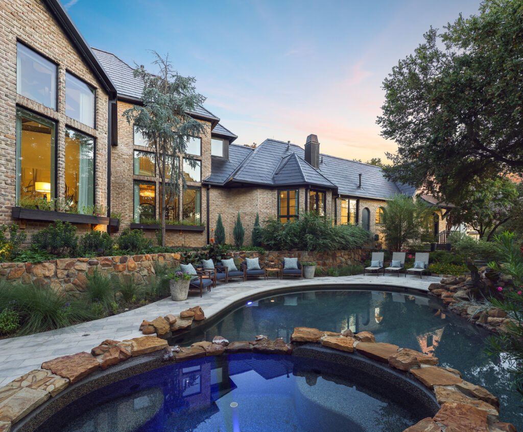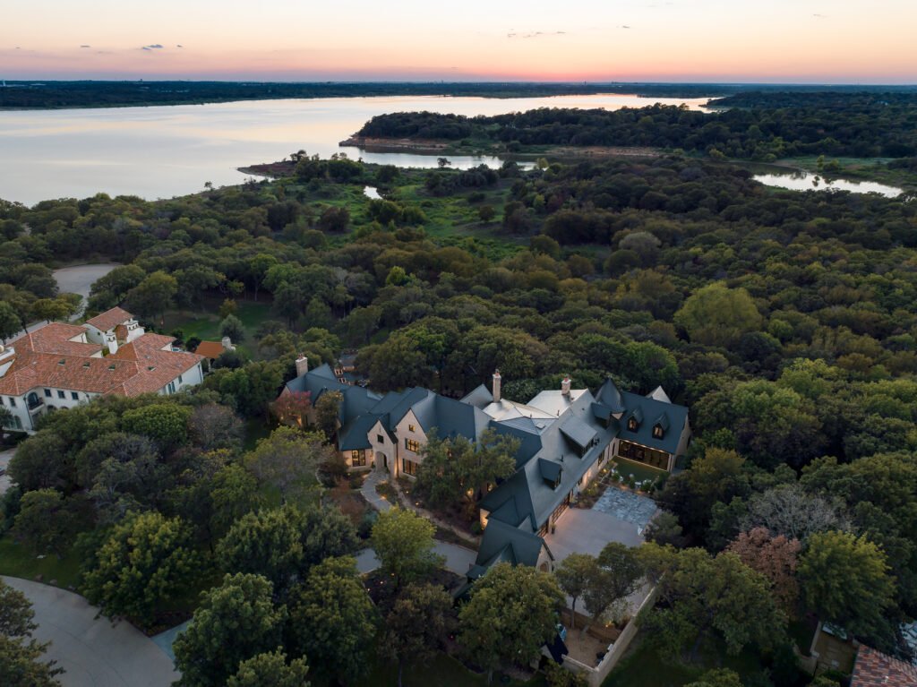 Beyond the interior, the estate’s outdoor spaces are equally breathtaking. Set on over two acres of manicured grounds, complete with over 5,000 trees, shrubs and perennials, the lush landscape is manicured and magic. A farm-to-table garden, an inviting pool, and several entertainment areas allow you to enjoy the tranquility of nature, with direct views of Grapevine Lake.