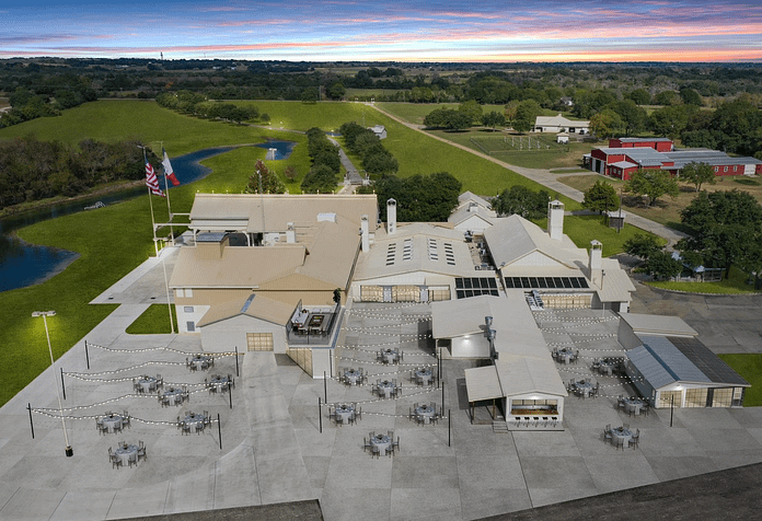 This massive 92-acre ranch, dubbed “Diamond L Ranch”, is located at 9950 Palestine Road in Brenham, Texas and features a main house, 19-stall horse barn, commercial workshop and a 32,000 square foot feed manufacturing facility.