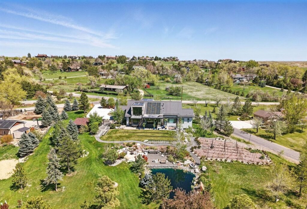 Overlooking the Flatirons and Front Range, this 1.38-acre luxury farmhouse blends modern design with rustic elegance. Expansive glass walls, steel details, a walnut double-island kitchen, koi pond, mini vineyard, and two-stall barn create a serene yet sophisticated retreat just minutes from downtown Boulder.