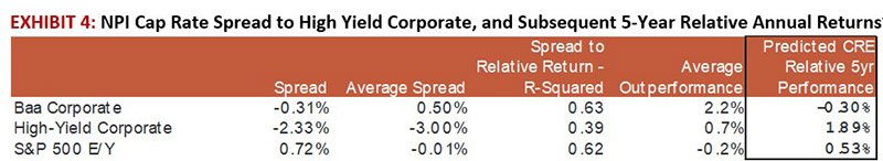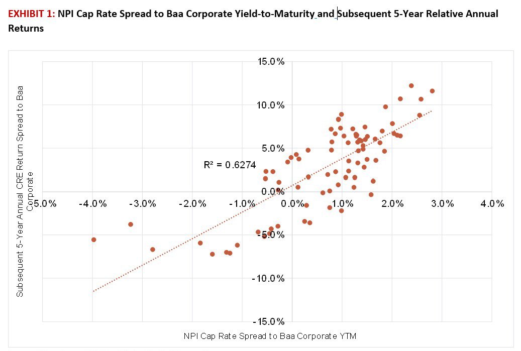 Historically, the spread between NPI cap rates and Baa corporates has been indicative of future relative performance, as shown in Exhibit 1: