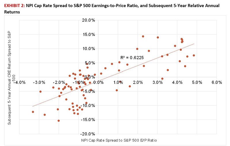 For equities, we compare the relationship of NPI cap rates to S&P 500 earnings-to-price ratio. While real estate property values are down 20 percent from their 2021/22 peak levels, the S&P 500 is up 38 percent over the same period. Valuations are elevated today compared to historical norms, with the adjusted P/E ratio at 25.3, the highest levels since before the “dot.com” bubble burst in 2001. The historical relationship of the spread between NPI cap rates and S&P 500 E/P ratio has been similarly predictive of future relative performance between the two asset classes, as shown in Exhibit 2, with an R-squared of 0.62, nearly identical to the relationship between NPI and Baa corporates demonstrated in Exhibit 1.