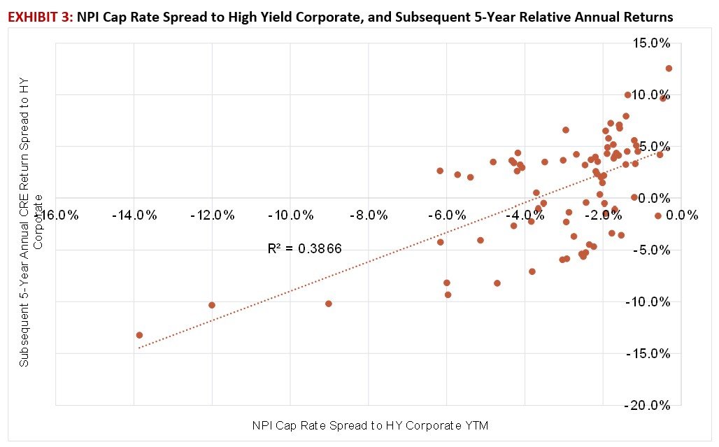 Turning to high-yield bonds, we evaluate the relationship between NPI cap rate spreads and the yield-to-maturity on the Bloomberg high-yield bond index. Similar to the analysis with Baa corporates, the spread has historically provided insight into subsequent relative performance between commercial real estate and high-yield debt. While the relationship is somewhat less pronounced, with an R-squared of 0.39, it remains statistically meaningful, as shown in Exhibit 3.