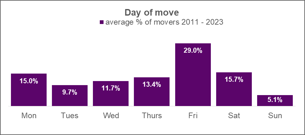 Looking at the most popular month and days to move, this translates into more than 220,000 moves in the month of August alone and over 550,000 people moving on Fridays over the course of the year.