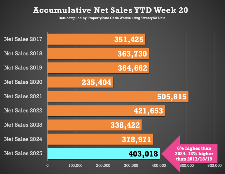 YTD 6% higher than week 20 of 2024 YTD and 9% higher YTD compared to 2017/18/19.