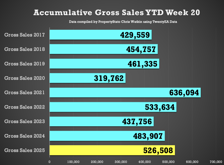 YTD 6% higher than week 20 of 2024 YTD and 9% higher YTD compared to 2017/18/19.