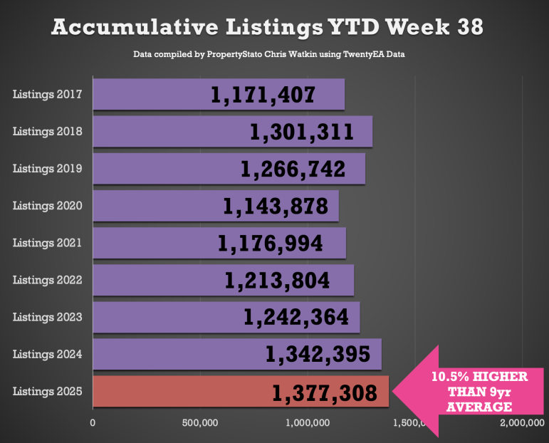 Year-to-date (YTD): 1.38m new listings, 2.6% higher than 2024 YTD (1.34m) and 10.5% above the 2017–19 average (1.25m).
