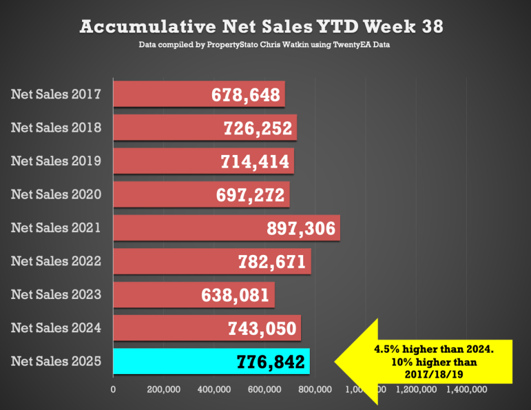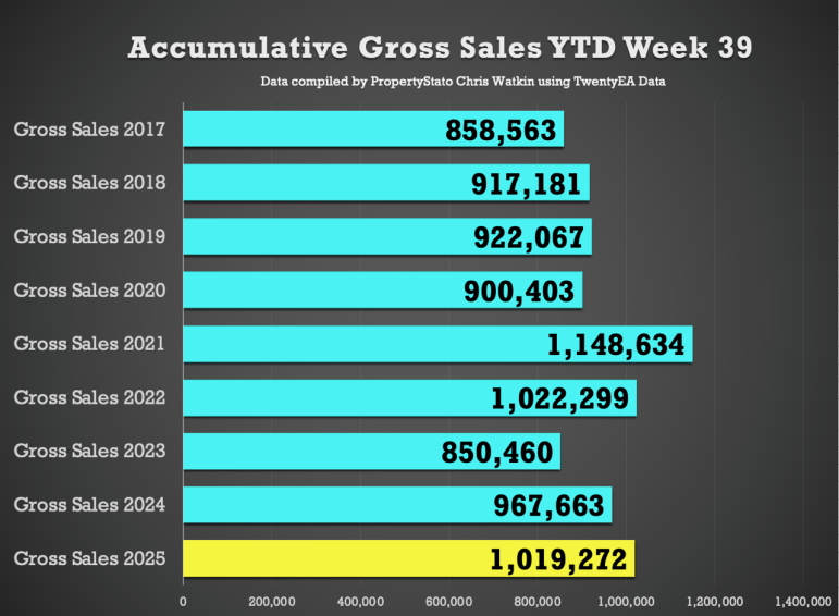 YTD: 1.019m gross sales, which is 5.3% ahead of 2024 (968k) and 13.3% above the 2017–19 average (899k).