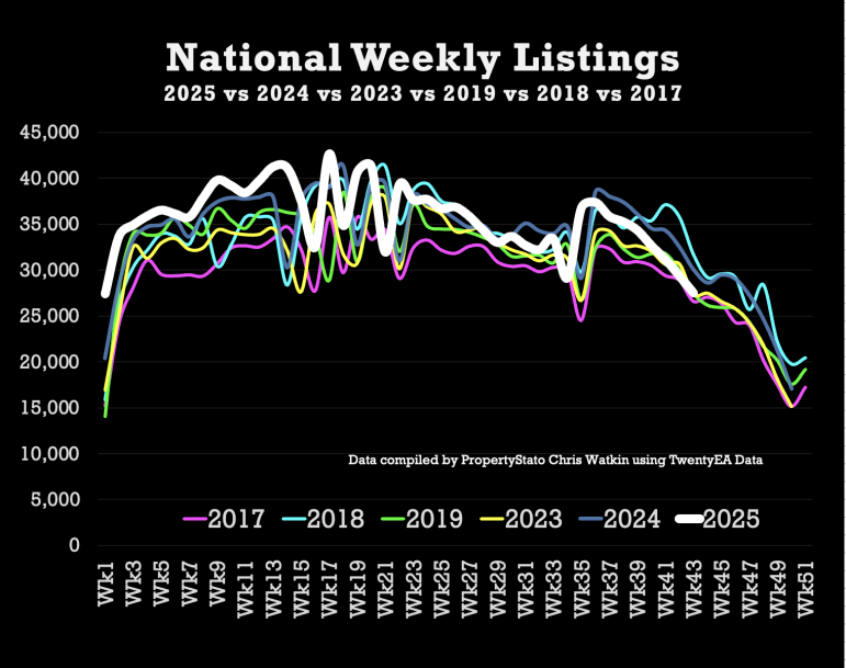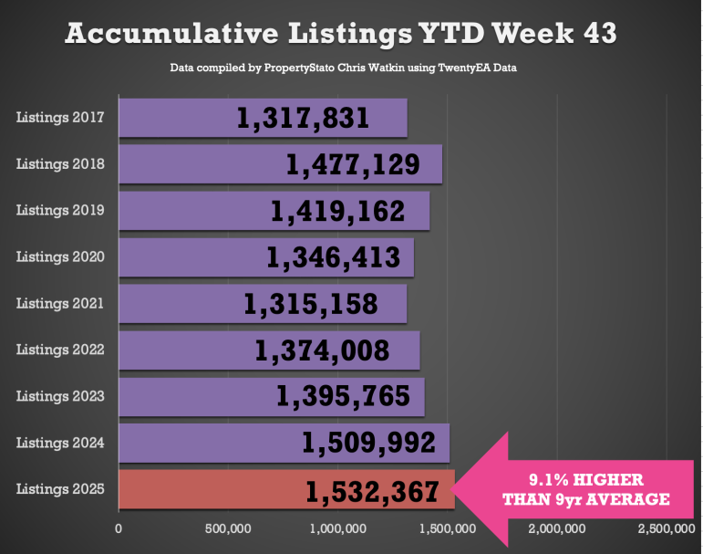 + Year-to-date (YTD): 1.53m new listings, 1.5% higher than 2024 YTD (1.51m) and 9.1% above the 2017–19 average (1.40m).