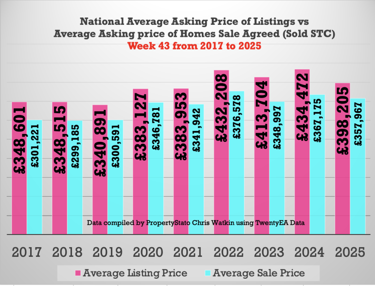 + Average Asking Price of listings last week £398k vs Average asking price of Sales Agreed (SSTC) – £358k – a 11.2% difference (long term 9-year average is 16% to 17%)