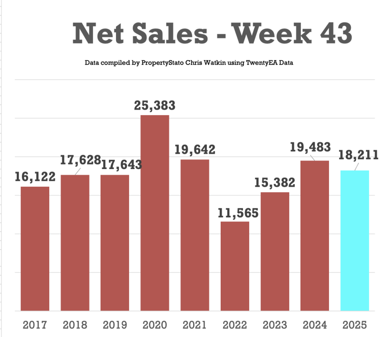 The number of UK homes sold subject to contract in whole of October 2025 slipped 2.6% compared with October 2024, falling from 114k to 111k.