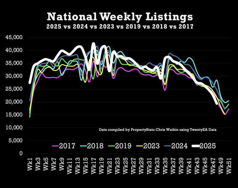 + Year-to-date (YTD): 1.652m new listings, 0.2% higher than 2024 YTD (1.649m) and 7.7% above the 2017–19 average (1.534m).