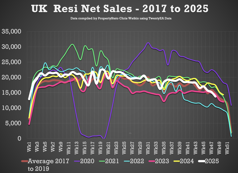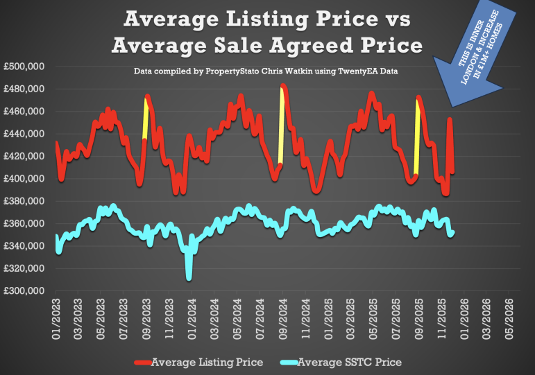 + 12.8k reductions this week, lower than last week’s at 13.2k (Estate Agents seem to forget they can reduce houses prices after the first week in November!). 23.2k is the average weekly number of reductions for 2025.