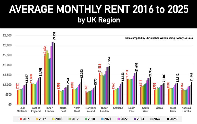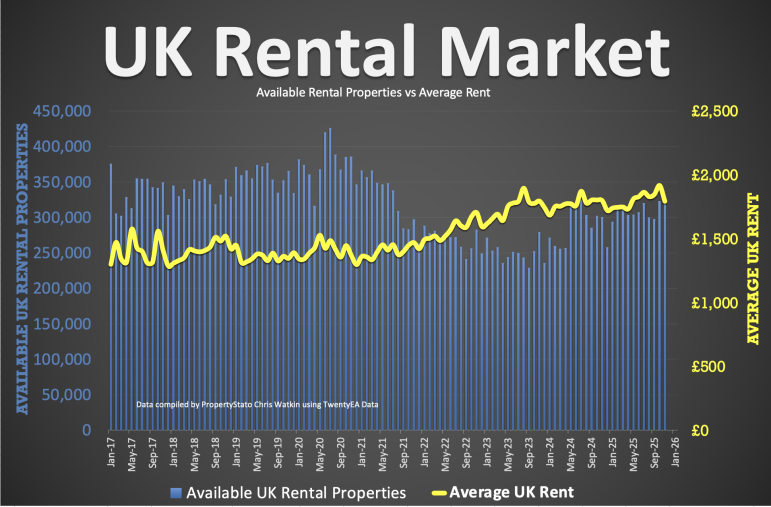 + Average Rent in November – £1,791 pcm – a drop of 6.5% from October ’25 when it was £1,916 pcm. For additional comparison, Average rent was £1,785 in Nov 2024 and £1,557 in Oct 2017.