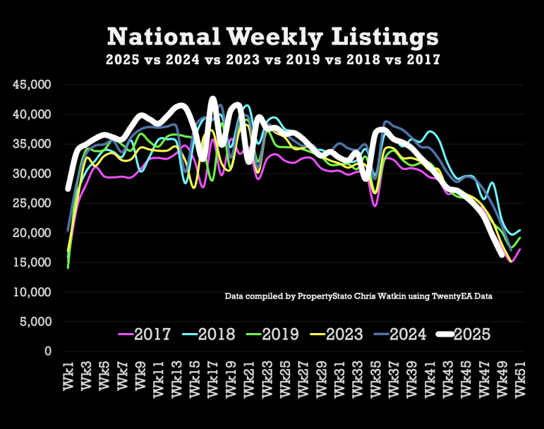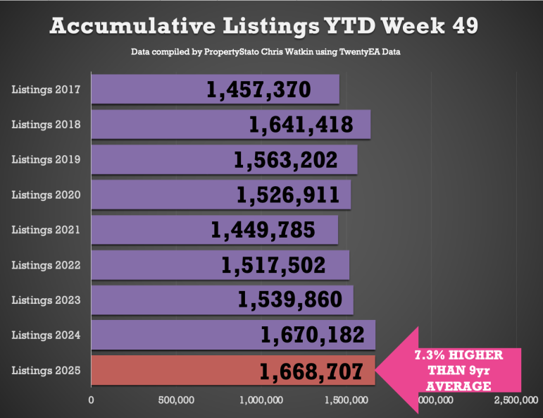 + Year-to-date (YTD): 1.669m new listings, 0.1% below than 2024 YTD (1.670m) and 7% above the 2017–19 average (1.559m).