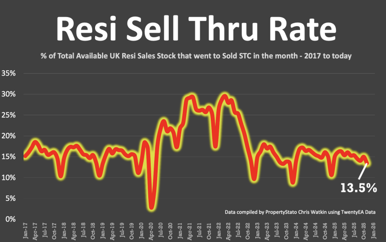 + 13.5% of homes on agents’ books went SSTC in November. Down from 15% in October, 14.1% in Sept, 14.5% in Aug, 15.4% in July, 15.3% in June, and 16.1% in May.