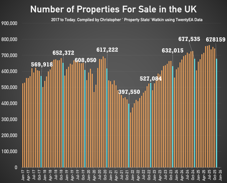 + 678k homes on the market on the 1st of December, down from 742k on 1st of November. December ’25 is identical to December ’24.