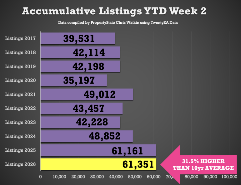+ Year-to-date (YTD): 61.3k new listings, 0.3% above than 2025 YTD (61.1k), 25.6% above 2024 YTD and 49% above the 2017–19 average (41.3k).