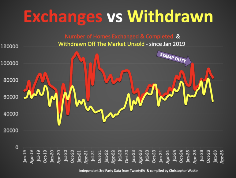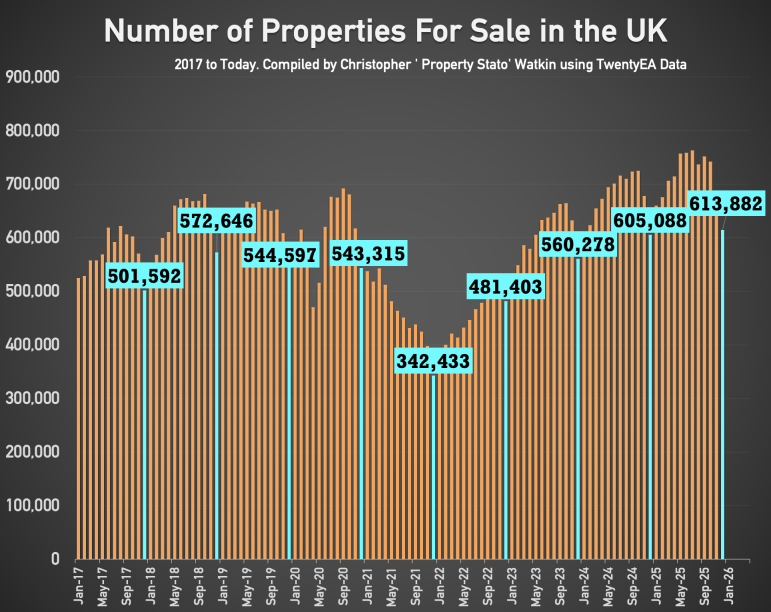 + 613k homes on the market on the 1st of January ’26 , down from 678k on 1st of December ’25 . (605k on the market on 1st Jan ’25 for comparison)