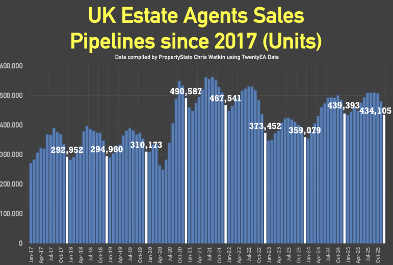 + 434k homes in agent’s sales pipeline on the 1st Jan 2026, almost identical than 12 months ago on 1st Jan ’25 (439k).