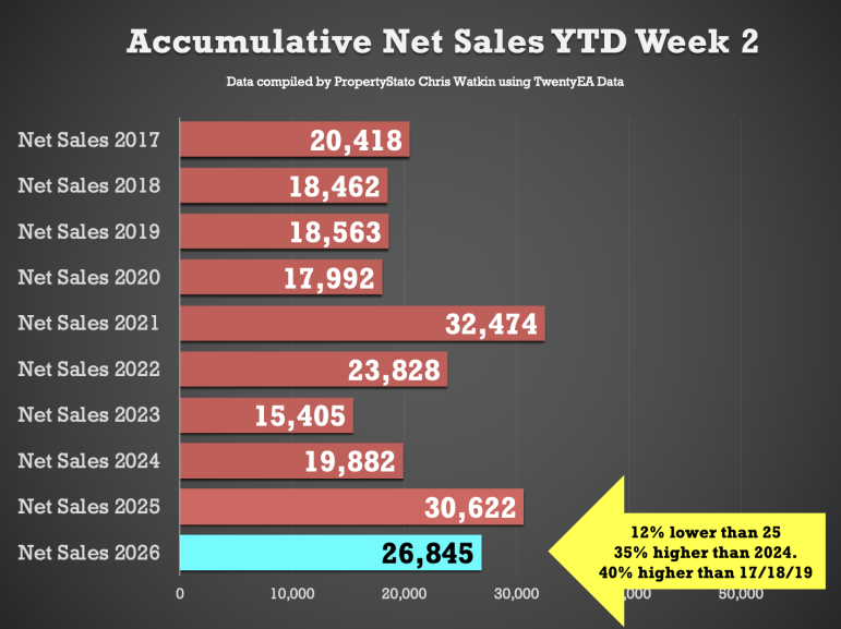 + YTD: 38.2k gross sales, which is 11.3% behind Week 2 YTD of 2025 (43k), yet 31% ahead of wk.2 2024 (29.1k) and 42.4% above the 2017–19 average (26.8k).