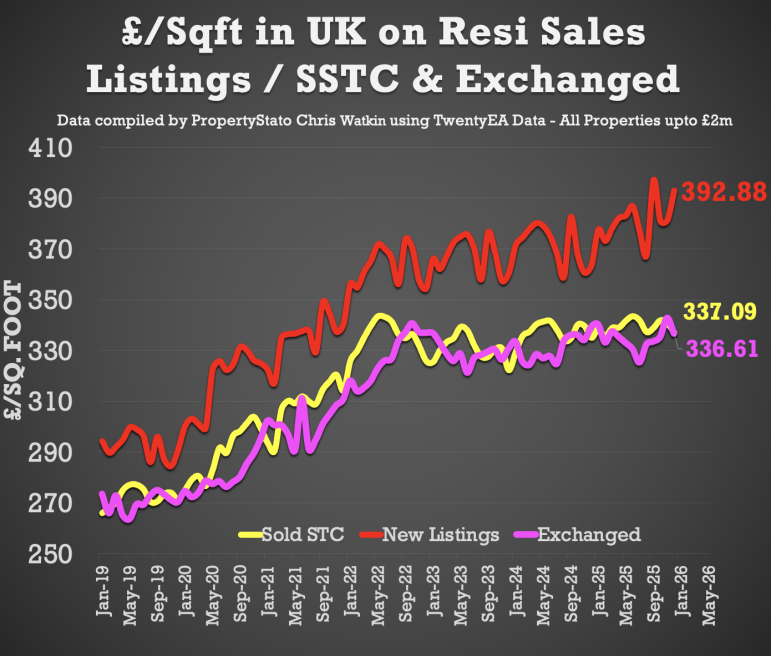 + December 2025 agreed sales averaged £337.09 per sq.ft. 0.6% higher than 12 months ago (£335.04) and 12.6% than 5 years ago (£299.30). The £/sqft at sale agreed matches the HM Land Registry Index with a 98% accuracy, 5 months in advance. That is why it is so important.